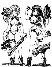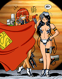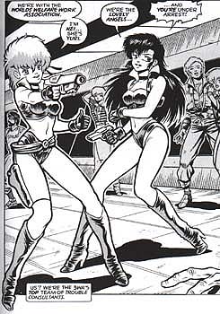 The comix version of the Lovely Angels actually draws many of its details from the novels and particularly the anime (originally from Classic, but lately also from Flash): a great many story elements and basic ideas can be traced back to specific stories and episodes. Warren, however, emphasizes the zanier aspects, extrapolating the "out-of-control" developments in the plot-lines and the technological features well beyond those in the Japanese versions.